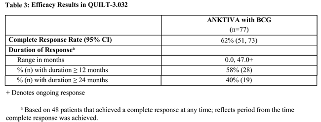 ANKTIVAÀÇ È¿´ÉÀº QUILT-3.032(NCT03022825) ½ÃÇè¿¡¼ Æò°¡µÇ¾ú´Ù. ÀÌ ¿¬±¸´Â °æ¿äµµ ¹æ±¤Á¾¾çÀýÁ¦¼ú(TURBT) ÀÌÈÄ BCG¿¡ ¹ÝÀÀÇÏÁö ¾Ê´Â °íÀ§Çè ºñ±ÙÀ°Ä§À±¼º ¹æ±¤¾Ï(NMIBC) Áß »óÇdz»¾Ï(CIS)À» µ¿¹ÝÇÑ ¼ºÀΠȯÀÚ 77¸íÀ» ´ë»óÀ¸·Î ÇÑ ´ÜÀϱº, ´Ù±â°ü ÀÓ»ó½ÃÇèÀ̾ú´Ù. ¿©±â¿¡´Â Ta/T1 À¯µÎ»ó º´º¯ÀÇ µ¿¹Ý ¿©ºÎ¿Í »ó°ü¾øÀÌ CIS¸¦ °¡Áø ȯÀÚµéÀÌ Æ÷ÇԵǾú´Ù.
