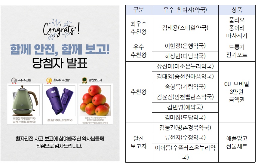 ¶Ç ȯÀÚ¾ÈÀü»ç°í º¸°í¼­¸¦ Á¤È®Çϰí Ãæ½ÇÇÏ°Ô ÀÛ¼ºÇÑ º¸°íÀÚ¿¡°Ô ¼ö¿©µÇ´Â ¾ËÂù º¸°íÀÚ»óÀº ±èµ¿°Ç ¾à»ç(¹æÃ̰æºÏ¾à±¹), ·ùÇöÁö ¾à»ç(¼öÁ¤¾à±¹), À̾Ƹ§ ¾à»ç(¼öÇ÷¯½º¿Â´©¸®¾à±¹) µîÀÌ ¼ö»óÇß´Ù