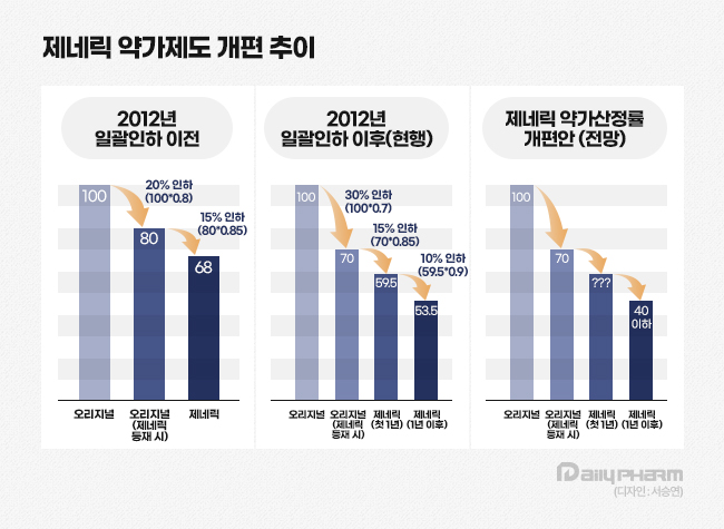 ÀÌ °¡¿îµ¥ ¾÷°èÀÇ ÃÖ´ë °ü½ÉÀº Á¦³×¸¯ ¾à°¡Á¦µµ °³ÆíÀÌ´Ù. Á¤ºÎ´Â 53.55%ÀÎ ÇöÇà Á¦³×¸¯ ¾à°¡ »êÁ¤·üÀÌ °úµµÇÑ °ÍÀ¸·Î ÆÇ´ÜÇÑ´Ù. ÀÌ¿¡ Á¦³×¸¯ ¾à°¡ »êÁ¤·üÀ» 40%·Î ³·Ãß´Â ¹æ¾ÈÀ» °ËÅä ÁßÀÌ´Ù. ÀÌ ½Ã³ª¸®¿À´ë·Î¸é ±âÁ¸¿¡ 1000¿ø¿¡ ÆÇ¸ÅÇÏ´ø Á¦³×¸¯À» ¾ÕÀ¸·Î´Â 747¿ø ÀÌÇÏ·Î ÆÇ¸ÅÇØ¾ß ÇÑ´Ù. Á¦³×¸¯ ¼öÀͼºÀÌ Áï½Ã 25% ÀÌ»ó ÁÙ¾îµå´Â ¼ÀÀÌ´Ù.