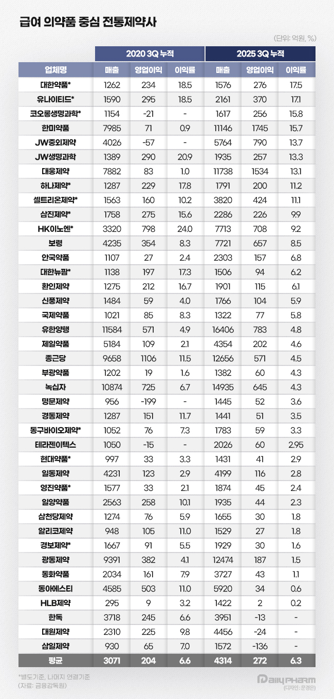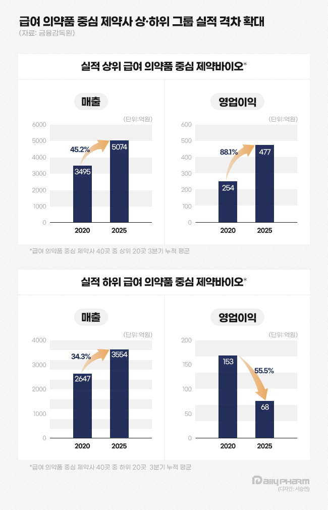 ±Þ¿© ÀǾàǰ Á᫐ Á¦¾à»ç ³»ºÎ¿¡¼µµ ¾ç±ØÈ Çö»óÀÌ ¶Ñ·ÇÇÏ°Ô ³ªÅ¸³µ´Ù. ±Þ¿© ÀǾàǰ Á᫐ Á¦¾à»ç °¡¿îµ¥ »óÀ§ 20°³»çÀÇ Æò±Õ ¸ÅÃâÀº 2020³â 3ºÐ±â 3495¾ï¿ø¿¡¼ 2025³â 3ºÐ±â 5074¾ï¿øÀ¸·Î 45.2% Áõ°¡ÇßÁö¸¸ ÇÏÀ§ 20°³»ç´Â 2647¾ï¿ø¿¡¼ 3554¾ï¿øÀ¸·Î 34.3% Áõ°¡ÇÏ´Â µ¥ ¸Ó¹°·¶´Ù.