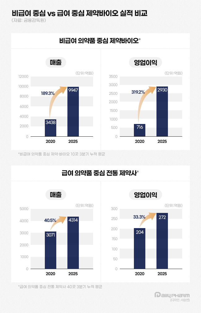 ¿µ¾÷ÀÌÀÍ·üÀ» ³õ°í º¸¸é ºñ±Þ¿© ÀǾàǰ Á᫐ ¾÷ü¿Í ±Þ¿© ÀǾàǰ Á᫐ ¾÷ü °£ ¿ÂµµÂ÷°¡ ´õ¿í ±Ø¸íÇÏ´Ù. ºñ±Þ¿© ÀǾàǰ Á᫐ ±â¾÷ÀÇ Æò±Õ ¿µ¾÷ÀÌÀÍ·üÀº 2020³â 20.8%¿¡¼ 2025³â 29.5%·Î Áõ°¡, °í¸¶Áø »ç¾÷ ±¸Á¶°¡ ´õ °ø°íÇØÁ³´Ù. ¹Ý¸é ±Þ¿© ÀÇÁ¸µµ°¡ ³ôÀº ÀüÅë Á¦¾à»çÀÇ Æò±Õ ¿µ¾÷ÀÌÀÍ·üÀº °°Àº ±â°£ 6.6%¿¡¼ 6.3%·Î ¶³¾îÁö¸é¼ ¼öÀͼºÀÌ µÇ·¹ ÈÄÅðÇÑ °ÍÀ¸·Î ³ªÅ¸³µ´Ù.