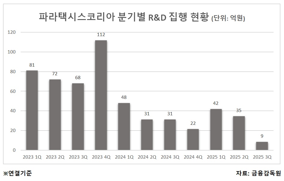 ÆÄ¶óÅýýºÄÚ¸®¾Æ R&D ÁöÃâ¾×Àº Áö³­ÇغÎÅÍ °¨¼ÒÇϱ⠽ÃÀÛÇß´Ù. ÀÌ È¸»ç R&D ÅõÀÚ ºñ¿ëÀ» ºÐ±âº°·Î º¸¸é 2023³â ºÐ±âº° Æò±Õ 8¾ï¿øÀ̾ú´ø ÅõÀÚ¾×Àº Áö³­ÇØ µé¾î Æò±Õ 33¾ï¿øÀ¸·Î ±Þ°¨Çß´Ù. 2023³â 1ºÐ±â 81¾ï¿ø ¼öÁØÀ̾ú´ø ÅõÀÚ¾×Àº 2ºÐ±â 72¾ï¿ø, 3ºÐ±â 68¾ï¿øÀ» ±â·ÏÇÏ´Ù 2023³â 4ºÐ±â 112¾ï¿øÀ¸·Î ÃÖ°íÄ¡¸¦ Âï¾ú´Ù.