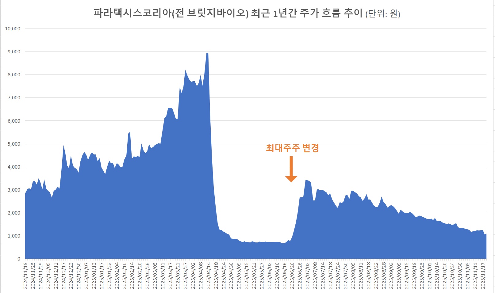 °æ¿µ±Ç º¯µ¿ ÀÌÈÄ ÀÓ»ó Áߴܰú R&D À§Ãà, Á¶Á÷ Ãà¼Ò°¡ °ãÄ¡¸é¼­ ½ÃÀå¿¡¼­´Â ÆÄ¶óÅýýºÄÚ¸®¾ÆÀÇ ½Å¾à°³¹ß Áö¼Ó °¡´É¼ºÀ» ¿ì·ÁÇÏ´Â ¸ñ¼Ò¸®µµ ³ª¿Â´Ù. ÀÌ °°Àº ºÒÈ®½Ç¼ºÀº ÁÖ°¡¿¡µµ ¹Ý¿µµÆ´Ù. ÆÄ¶óÅýýº Àμö ±â´ë°¨À¸·Î 6¿ù ¸» ÀϽà ¹ÝµîÇß´ø ÁÖ°¡´Â ÀÓ»ó ÃëÇÏ¿Í Á¶Á÷ Ãà¼Ò ¿ì·Á°¡ °ãÄ¡¸ç ´Ù½Ã ¾à¼¼·Î µ¹¾Æ¼± ¸ð½ÀÀÌ´Ù. 21ÀÏ Á¾°¡ ±âÁØ ÀÌ È¸»ç ÁÖ°¡´Â 1011¿øÀ¸·Î 52ÁÖ ÃÖ°í°¡ÀÎ 9280¿ø ´ëºñ ¾à 89% Ç϶ôÇÑ ¼öÁØÀÌ´Ù.
