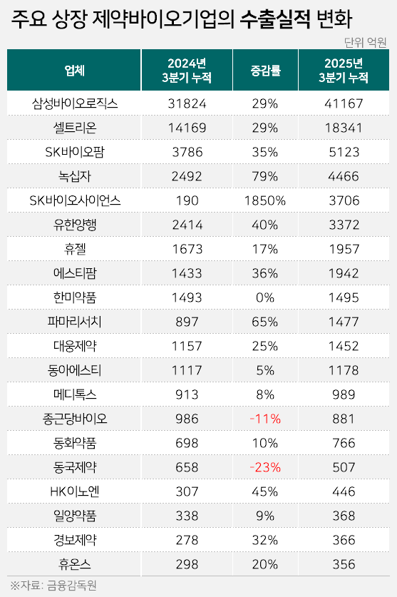 SK¹ÙÀÌ¿ÀÆÊ¡¤³ì½ÊÀÚ¡¤SK¹ÙÀÌ¿À»çÀ̾𽺡¤À¯ÇѾçÇࡤ¿¡½ºÆ¼ÆÊ¡¤ÆÄ¸¶¸®¼­Ä¡¡¤HKÀ̳뿣¡¤°æº¸Á¦¾àÀÇ ¼öÃâ½ÇÀûÀÌ 1³â »õ 30% ÀÌ»ó Áõ°¡Çß´Ù. »ï¼º¹ÙÀÌ¿À·ÎÁ÷½º¡¤¼¿Æ®¸®¿Â¡¤´ë¿õÁ¦¾à¡¤È޿½º´Â 20% ÀÌ»ó ´Ã¾ú°í, ÈÞÁ©¡¤µ¿¾Æ¿¡½ºÆ¼¡¤¸ÞµðÅ彺¡¤µ¿È­¾àǰ¡¤ÀϾç¾àǰµµ °¢°¢ Àü³â´ëºñ Áõ°¡ÇÑ °ÍÀ¸·Î ³ªÅ¸³µ´Ù. Çѹ̾àǰÀº Àü³â´ëºñ ¼ÒÆø ´Ã¾ú°í, Á¾±Ù´ç¹ÙÀÌ¿À¿Í µ¿±¹Á¦¾àÀº °¨¼ÒÇß´Ù.