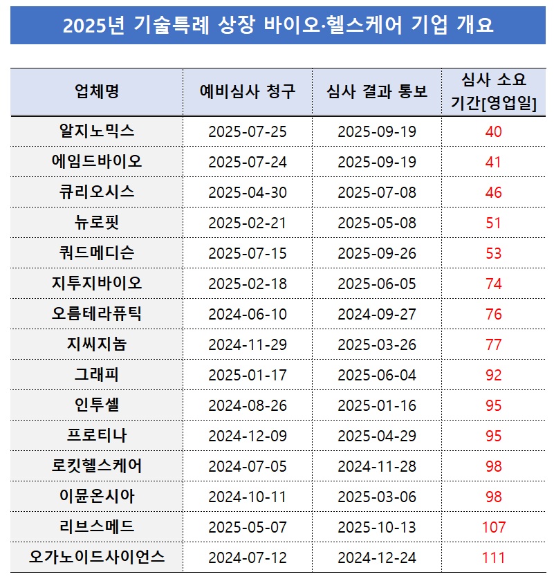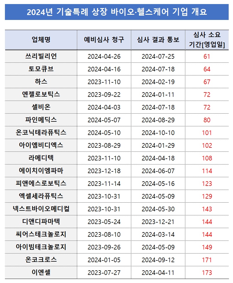 27ÀÏ Çѱ¹°Å·¡¼Ò¿¡ µû¸£¸é ¿ÃÇØ ±â¼úƯ·Ê·Î ÄÚ½º´Ú¿¡ ½Å±Ô »óÀåÇÑ ¹ÙÀÌ¿À¡¤ÇコÄÉ¾î ±â¾÷ 15°÷ÀÌ °Å·¡¼Ò »óÀå ¿¹ºñ½É»ç¸¦ Åë°úÇÏ´Â µ¥ °É¸° ±â°£Àº Æò±Õ 76.9¿µ¾÷ÀÏÀÌ´Ù. ±â¾÷µéÀÌ ¿¹ºñ½É»ç û±¸¼­¸¦ Á¦ÃâÇÏ°í ½ÇÁ¦ ½É»ç °á°ú¸¦ Å뺸¹Þ±â±îÁö ¾à 3.6°³¿ùÀÌ ¼Ò¿äµÆ´Ù.