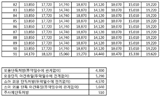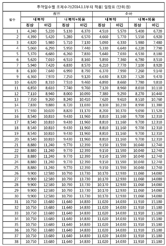ºóµµ¼ö°¡ °¡Àå ³ôÀº 3ÀÏÄ¡ Á¶Á¦·á¸¦ º¸¸é ¼ºÀÎ ³»º¹¾à 4820¿ø, ¾ß°£ ÇÒÁõÀÌ Àû¿ëµÇ¸é 5980¿øÀÌ µÈ´Ù. ³»º¹¾à+¿Ü¿ëÁ¦´Â ÁÖ°£ 5710¿ø, ¾ß°£ 7130¿øÀÌ´Ù.