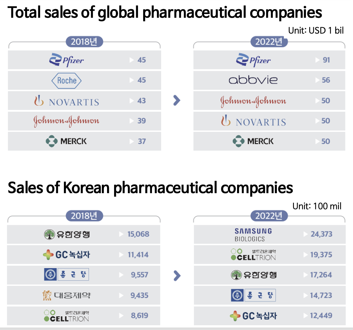 In 2022, global pharmaceutical giant Pfizer and Korean pharmaceutical giant Samsung Biologics took the top spots in terms of sales, earning KRW 91 billion and KRW 2.437 trillion, respectively.