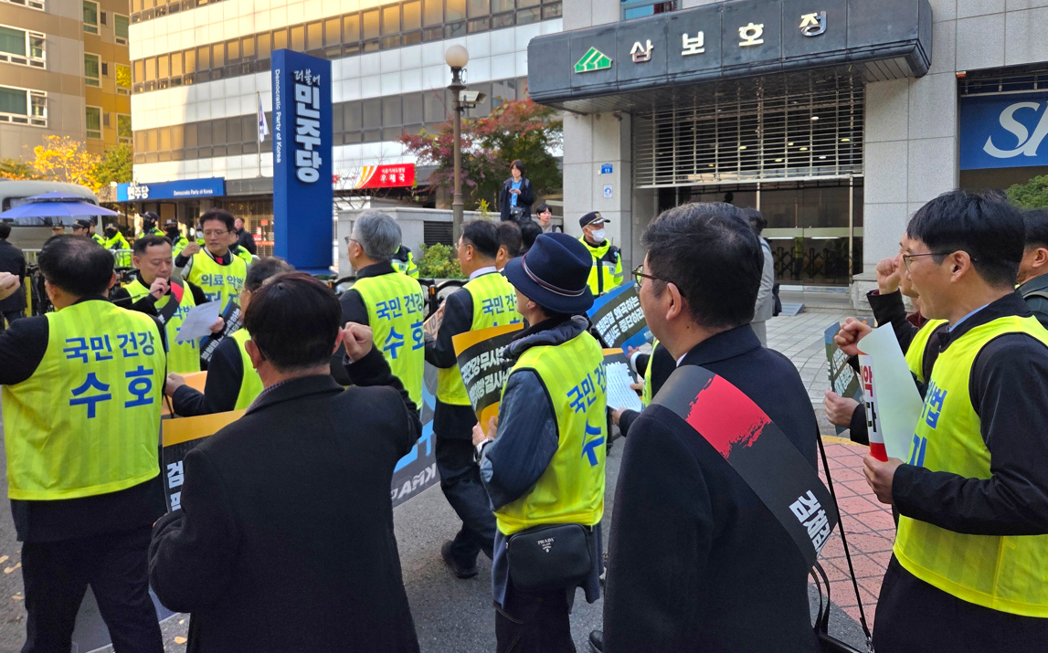 Representatives of doctors nationwide gathered in front of the National Assembly on the 16th to protest the government’s push to mandate international nonproprietary name (INN) prescriptions and allow Korean medicine practitioners’ use of X-ray devices.