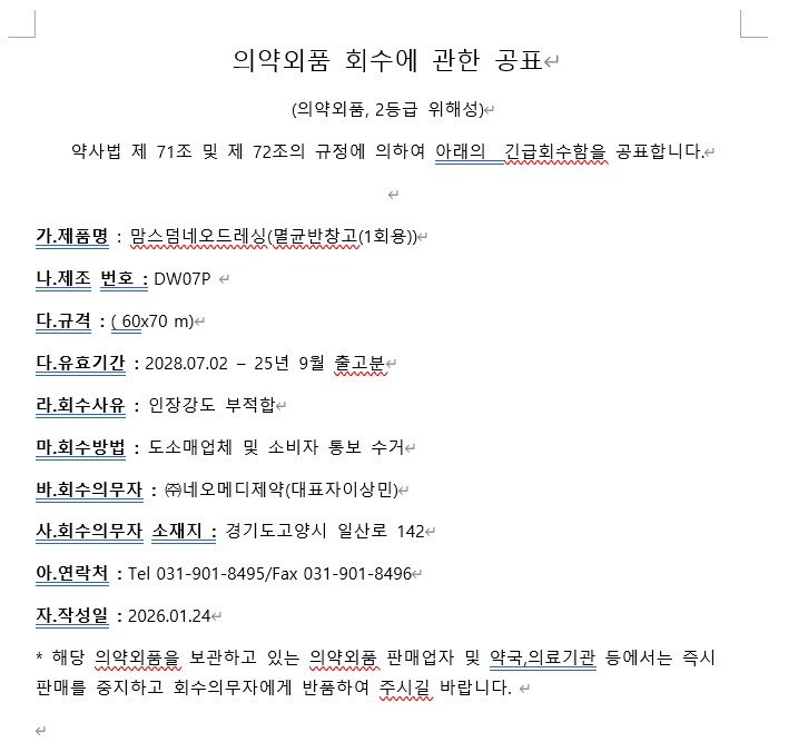 네오메디제약 '1회용 멸균반창고' 회수