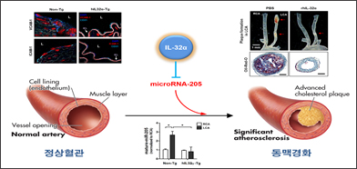 특히 인간 IL-32α 유전자 발현 및 인간 IL-32α 재조합 단백질 투여를 통해 뇌졸중, 심장마비, 동맥경화 등의 뇌심혈관질환 발병 주요한 원인으로 알려진 혈관내피세포 염증현상을 매우 효과적으로 억제할 수 있음을 규명하였으며 이 과정에서 마이크로RNA (miRNA 205) 생성 과정 조절을 통하여 혈관염증 및 동맥경화를 억제한다는 사실도 함께 세계 최초로 규명했다.