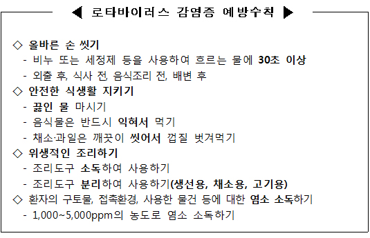 또한 로타바이러스 감염증을 예방하기 위해서는 손씻기 등 수인성·식품매개 감염병 예방수칙을 준수하고 환자 구토물 처리 시 소독 등 집단 시설의 철저한 환경 관리를 강조했다.
