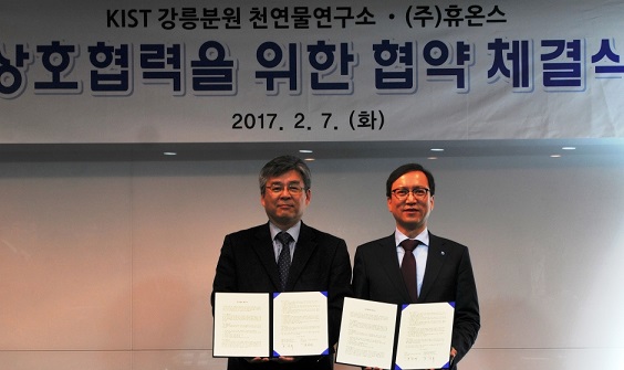 휴온스는 KIST 강릉분원에서 천연물 소재의 글로벌 건강기능식품, 화장품 및 의약품 개발의 R&D 협력 강화를 위한 업무협약(MOU)을 체결했다.
