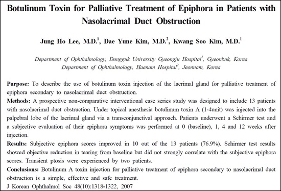 유루증과 보툴리눔 톡신의 인연을 되짚어 보면 이미 1990년대에 보툴리눔 A형 독소를 기능적인 누도폐쇄 환자의 눈물샘에 투여할 경우 효과가 있다는 보고가 있었다(Ophthalmology 1999;106:2333-4).
