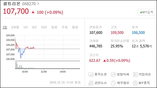 세계 최초의 항암 #바이오시밀러 트룩시마가 유럽의약품청(EMA)으로부터 맙테라(리툭산)의 모든 적응증에 대해 승인권고를 받았다는 소식이 전해진 19일 오전 9시 5분 기준, 셀트리온 주식은 10만 8200원에 거래되고 있다. 전일 종가(10만 7600원)와 비교해서도 0.56% 올랐다.