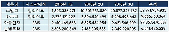 한편 국내 C형간염 시장에는 MSD의 #제파티어(엘바스비르/그라조프레비르)가 내년 초 시장진입을 앞두고 있으며, 애브비도 옴비타스비르와 파리타프레비르/리토나비르 복합제에 다사부비르를 추가한 경구요법제의 식약처 허가를 기다리는 중이다.