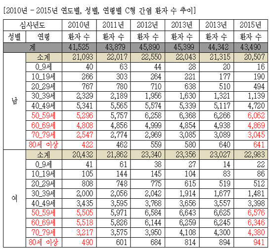 보건복지부와 질병관리본부가 발간한 ‘2014년 국민건강통계’에서도 C형 간염의 유병률이 40대 0.5%, 50대 0.9%, 60대 1.3%, 70대 이상 1.9%로 나이가 많을수록 높아지는 것으로 조사됐었다.