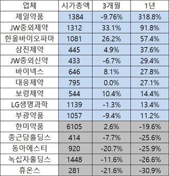 - 상위제약그룹 1년 시가총액 하향세, 한올-삼진 등 중견사 성장