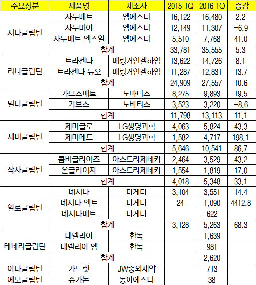제미글립틴과 비슷한 시기에 나온 삭사글립틴도 앞선 품목들에 비하면 파괴력은 적지만 꾸준히 성장하고 있다. 온글라이자와 콤비글라이자 형제는 전년 동기 대비 33.1% 오른 53억원의 처방액을 기록했다.