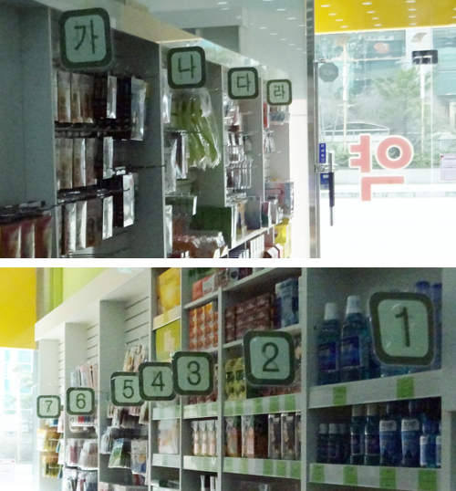 그 중 다른 약국과 다르게 눈에 띄는 것은 의약외품 진열 공간. '가, 나, 다'와 '1,2,3' 번호가 어른 키 높이에 일렬로 붙어있다. 진열칸마다 하나씩이다. 카운터가 길어 약사가 일일이 나와 집어주기 어려운 공간에서 환자가 찾는 제품 위치를 가,나,다 와 1,2,3으로 설명하기 위해서다.