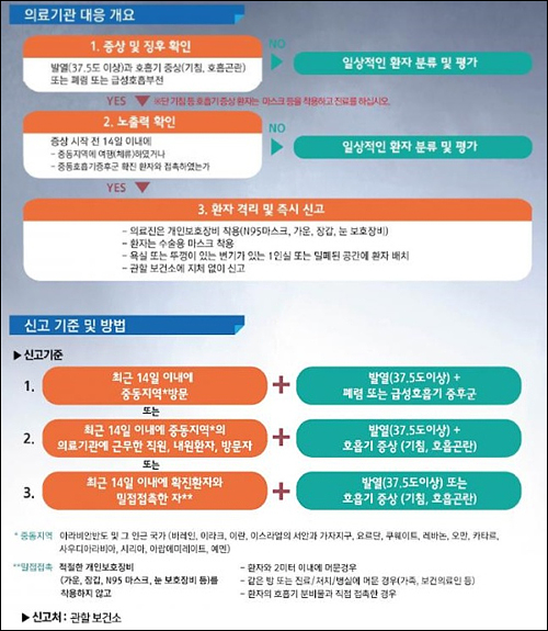 대한의사협회는 '메르스(중동호흡기증후군) 의심환자 내원시 행동지침'으로 발열과 호흡기 증상 또는 폐럼, 급성호흡부전을 보이는 지 증상과 증후를 확인하고, 증상 시작전 14일 이내 동지역에 여행했거나 메르스 확진환자와 접촉여부 등 노출력을 확인하라고 안내하고 있다.