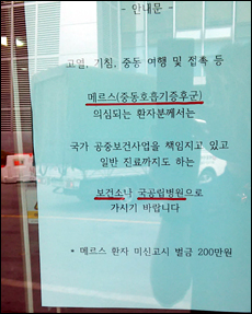 급기야 일부 의원에서는 '메르스 의심환자는 보건소나 국공립병원으로 가시기 바랍니다'라는 안내문을 부착하기에 이르렀다.