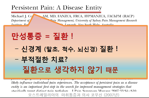 만성통증은 신경계인 말초, 척수, 뇌신경 질환 등으로 질환으로 적극적인 조기 치료가 중요하다.