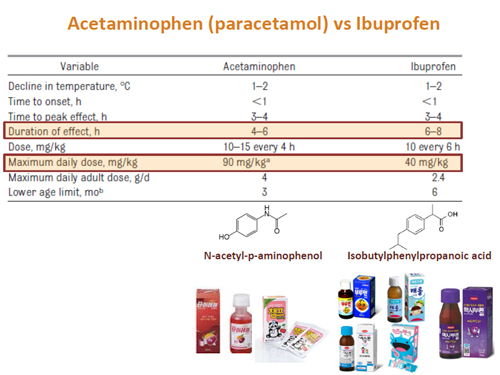 해열제는 크게 아세트아미노펜, 이부브로펜 두가지 계열이 있다. 비용, 부작용 측면 등에서 세계적으로 아세트아미노펜을 우선 선택제로 권고하고 있다.