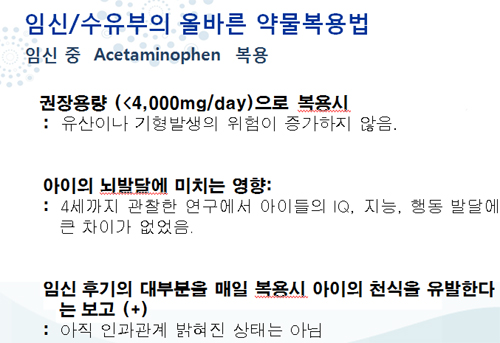 임신수유부의 아세트아미노펜 성분 해열진통제의 올바른 복용법은 먼저 하루 권장용량은 4000mg이다. 임신 중 통증 조절이 필요할 때 사용이 용이하며 엄마가 복용 후 모유로 아이에게 전해지는 양은 6%에 불과하다. 별다른 영향은 없다고 볼 수 있다는 게 전문가의 설명이다.