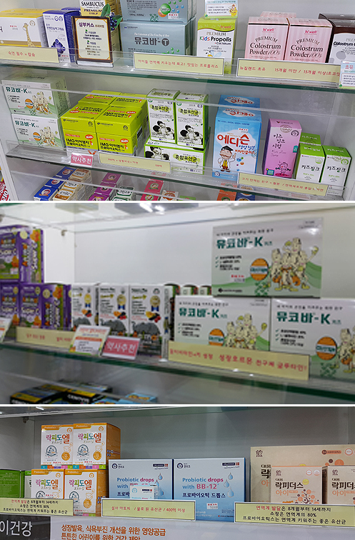 '아이들 면역력 키우는데 최고, 맛있는 프로폴리스', '뉴질랜드 초유/15개월 이상/쵸코맛', '설사 아토피/물로 된 유산균/400억 이상'부터 '뇌 발달은 36개월 이전에 끝, 오메가3와 칼슘으로 우리 아이 뇌를 도와주세요'와 같은 POP는 그렇게 나왔다.