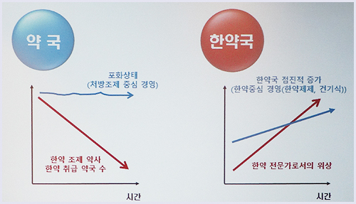 그는 "한약제제와 건기식 등으로 무장한 한약국은 점진적으로 증가하게 된다. 화화적 의약품은 이제 임계상황에 왔다. 결국 바이오, 천연물신약의 시대가 올 것"이라며 "결국 한약사가 한약 전문가로서의 위상이 증가할 가능성이 높다"고 주장했다.