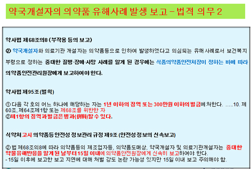 이 부센터장에 따르면 현재도 환자가 의약품 복용 후 입원 이상의 중대 유해사례를 인지한 약사가 15일 이내 관련 사실을 보고하지 않아 처벌받는 사례가 발생하고 있다.