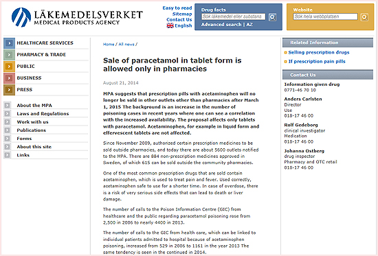 스웨덴 보건당국이 아세트아미노펜 제제의 소매점 판매를 중단시킨 가장 큰 이유는 역시 안전성에 문제였다.