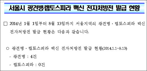 대한동물약국협회(www.kvpa.net)에 따르면 최근 대한민국 정보공개포탈을 통해 서울지역광견병 백신과 렙토스피라 백신 전자처방전 발행건수를 요청한 결과 올 한해 발행된 처방 전은 총 4건에 불과했다.