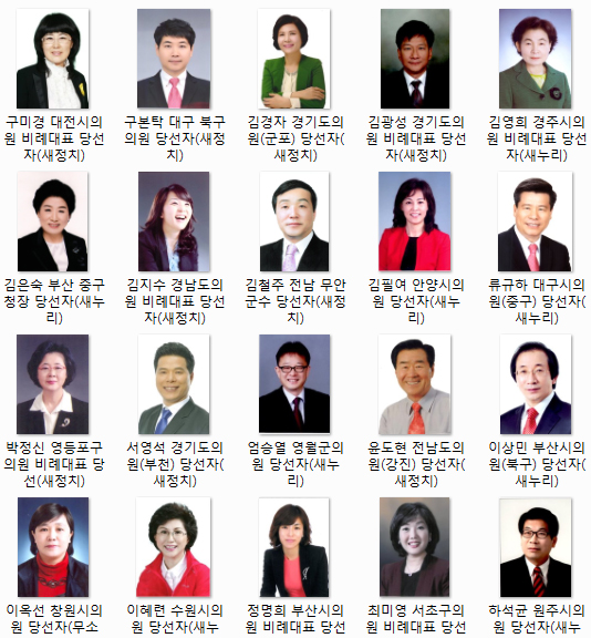 경기도의원 새누리 비례 7번 공영애 후보는 당선 커트라인 5번에 포함되지 못했고 경남도의원 새누리 비례 5번 윤성미 후보도 아깝게 고배를 마셨다. 서울시의원 새정치 비례 7번인 권영희 후보도 낙선했다.