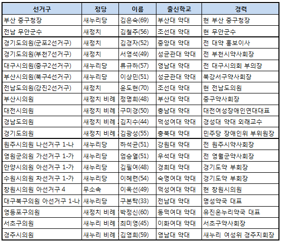 ◆약사출신 당선인 = 기초단체장 2명, 광역의원 9명, 기초의원 9명이 약사출신으로 채워졌다.