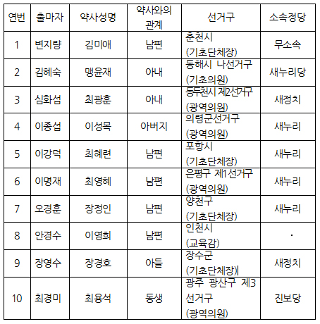 최광훈 대한약사회 부회장의 아내 심화섭 후보(새정치)는 경기도의원 후보로 나서고, 경북 이성목 약사의 아버지인 이종섭 후보는 경북도의원에 출마했다.