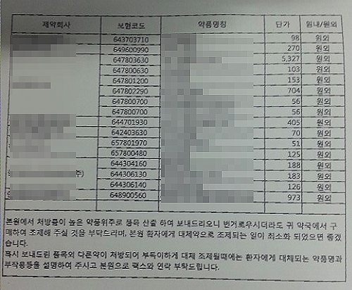 안내글에서 의원은 "처방률이 높은 약 위주로 품목을 산출해서 보내드리니 번거우시더라도 귀 약국에서 구매해 조제해 주실 것을 부탁드린다"고 전했다.