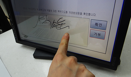 약사의 복약지도를 제공받은 환자는 터치스크린에 나타난 '복약지도 확인 수령서'에 동의 또는 거부를 선택하고 전자 서명을 진행하는 방식이다. 오 대표는 "복약지도 의무화가 시행되고 이후 관련법이 더 강화될 수 있다는 점에서 일부 약사님들이 불안해하시는 것으로 알고 있다"며 "만에 하나 발생할 수 있는 환자의 시비를 방지하기 위해 환자 동의 기능을 추가하게 됐다"고 설명했다.