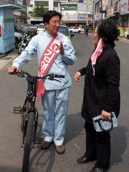 자전거 타고 건강 상담하며 선거운동하는 약사