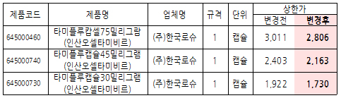 타미플루는 사용량-약가 연동제가 적용돼 타미플루캡슐75mg은 1캡슐당 3011원에서 2806원으로 205원 인하된다.