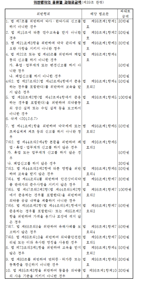 50만원 과태료는 연수교육 미필 시도지사가 명한 보고 하지 않은 경우 약국제제 또는 조제실제제 등의 신고를 하지 않은 경우 등이다. 100만원 과태료를 의약품생산실적 미보고 등 단 2개다.