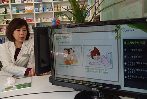 약사가 마우스로 이것 저것 체크하며 설명하면 환자는 별도 설치된 모니터에서 약사가 체크하는 내용을 확인하고 약사의 말에 귀 기울인다.