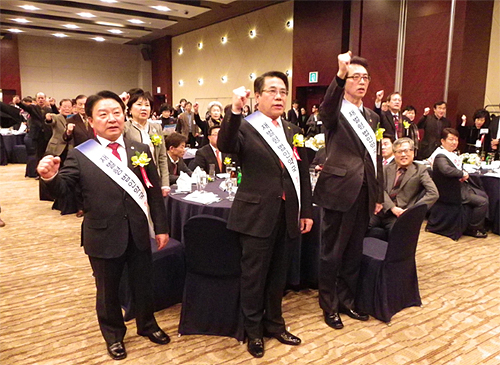 이어 시약사회 대의원들은 '법인약국 허용되면 외국체인 못막는다' 등 법인약국 저지 구호를 외치며 결의를 다졌다.