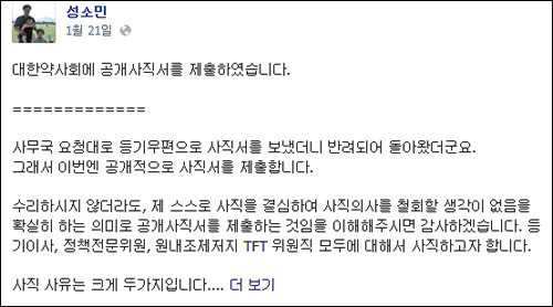 성 약사는 지난 21일 자신의 페이스북에 '대한약사회에 공개 사직서를 제출합니다'를 제목으로 사임 의사를 전했다.