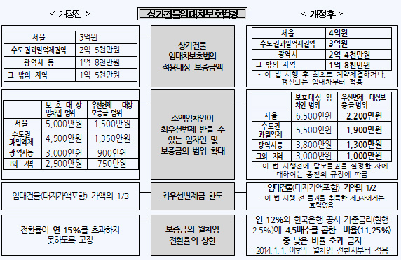 2010년 시행령을 개정한 이후의 보증금 상승률 등을 고려해 보호대상 임차인의 범위가 29.5%에서 37.7%까지 확대되도록 금액을 상향했고 우선변제를 받을 보증금의 범위도 넓어졌다.