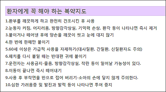 60세 이상은 가급적 사용을 자제하도록 하고 패치를 다시 붙일 때는 반대편 귀에 붙이도록 한다. 또 운전자는 졸음이나 방향감각 상실, 착란 등이 일어날 수 있는 만큼 사용하지 않도록 하는 게 좋다.