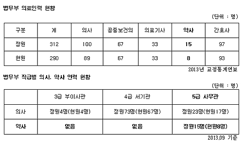법무부 역시 근무 중인 약사 수가 적을 뿐만 아니라 의사들에 비해 직급도 제한돼 있는 형편이다.