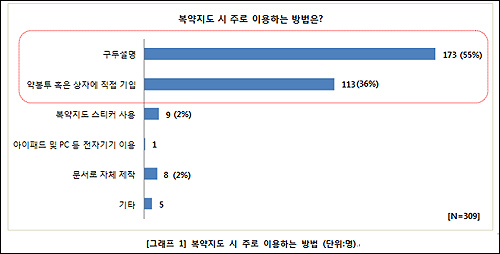 설문에 참여한 약사 중 절반 이상은 구두설명으로 복약지도를 진행 중인 것으로 확인됐다. 복약지도에 주로 이용하는 방법을 묻는 질문에 응답자 중 55%(173명)가 구두설명을 꼽았으며 '약봉투나 약 상자에 필요한 내용을 직접 기입한다'가 36%(113)로 뒤를 이었다.