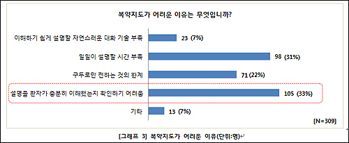 응답자 중 98%(305명)가 복약지도에 어려움을 느끼고 있다고 답했으며, 복약지도가 잘 되지않는 이유로는 '환자가 충분히 이해했는지 확인이 어려원서'가 33%(105명), '일일이 설명할 시간이 부족해서'가 31%(98명)였다. '구두로만 전하는데 한계를 느낀다'고 답한 약사가 22%(71명)로 뒤를 이었다.