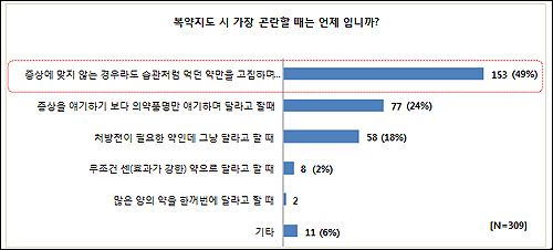 약사들은 복약지도 과정 중 '증상에 맞지 않는 경우라도 습관처럼 먹던 약만을 고집하며 상담을 거부할 때(49%, 153명)'를 가장 곤란한 순간으로 꼽았다.